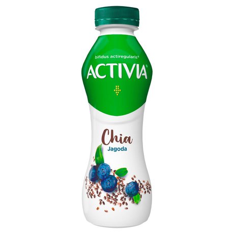 mleko odtłuszczone, woda, cukier, śmietanka (z mleka), przecier jagodowy 2%, nasiona chia (szałwia hiszpańska) 0,6%, błonnik cytrusowy, koncentrat soku cytrynowego, naturalny aromat, bakterie: jogurtowe (10? jtk/g), ActiRegularis Bifidobacterium CNCM I-2494 (4 x 10? jtk/g), białka mleka