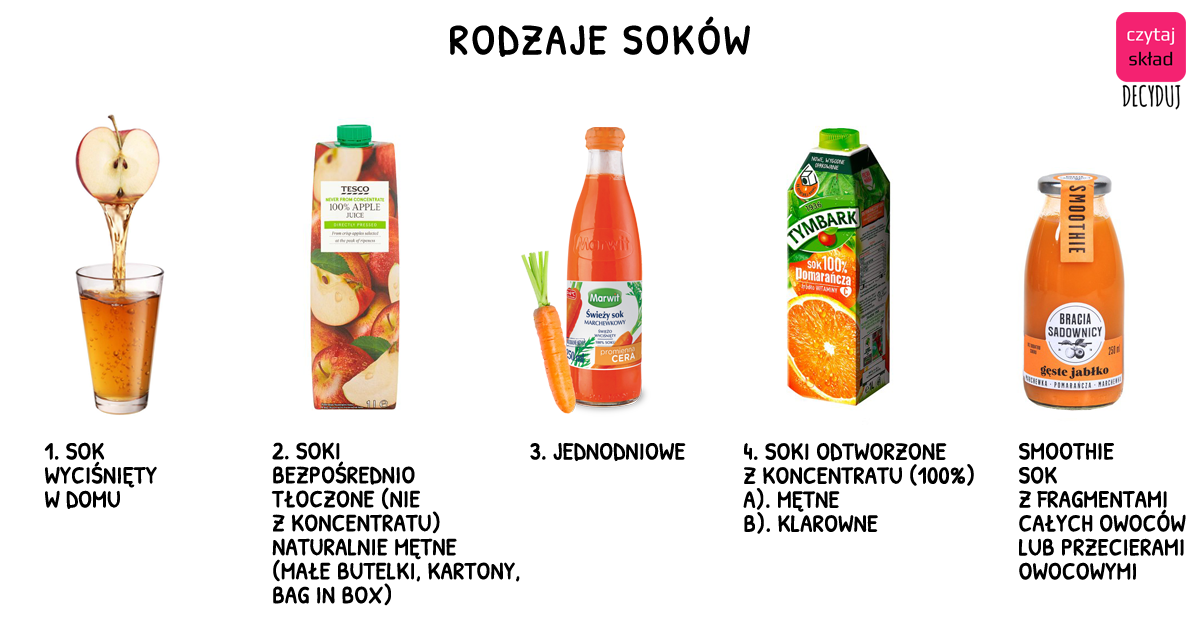 Sokami najmniej atrakcyjnymi (choć nie bezwartościowymi) pod kątem wartości odżywczej będą soki odtworzone z koncentratu (inaczej nazywane 100%). Ze względu na wysokie koszty składowania wody (czy jej transportu w przypadku soków z owoców, które nie rosną w naszej strefie klimatycznej) większość soków owocowych jest zaraz po tłoczeniu zagęszczana poprzez odparowanie wody. Zanim sok trafi do kartonu dodaje się wodą w ilości jaka została wcześniej odparowana. Ponieważ sok taki kilka razy spotyka się z wysoką temperaturą będzie mniej zasobny w składniki takie jak witamina C czy przeciwutleniacze. Często też takie soki są produkowane w wersji klarownej, a więc są zupełnie pozbawione błonnika pokarmowego oraz tych składników bioaktywnych, które są z nim związane chemicznie.Jeżeli decydujemy się na sok odtworzony warto wybierać te mętne – jak choćby pomarańczowy czy mętne soki jabłkowe – będą się cechowały wyższą wartością odżywczą.