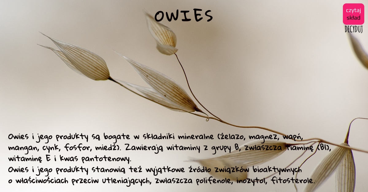 Owies, zboże tzw. niechlebowe, w Polsce wciąż jest mało popularne. Próby upowszechnienia ziarna owsa na cele konsumpcyjne zapoczątkował dopiero w latach 90-tych XX wieku Uniwersytet Przyrodniczy w Poznaniu. Owies jest zbożem o wyjątkowej wartości żywieniowej, uważany jest za żywność funkcjonalną, czyli taką, która nie tylko przedstawia wartość odżywczą, ale wykazuje działanie prozdrowotne. Może więc warto zainteresować się produktami z owsa i wprowadzić je do codziennej diety?